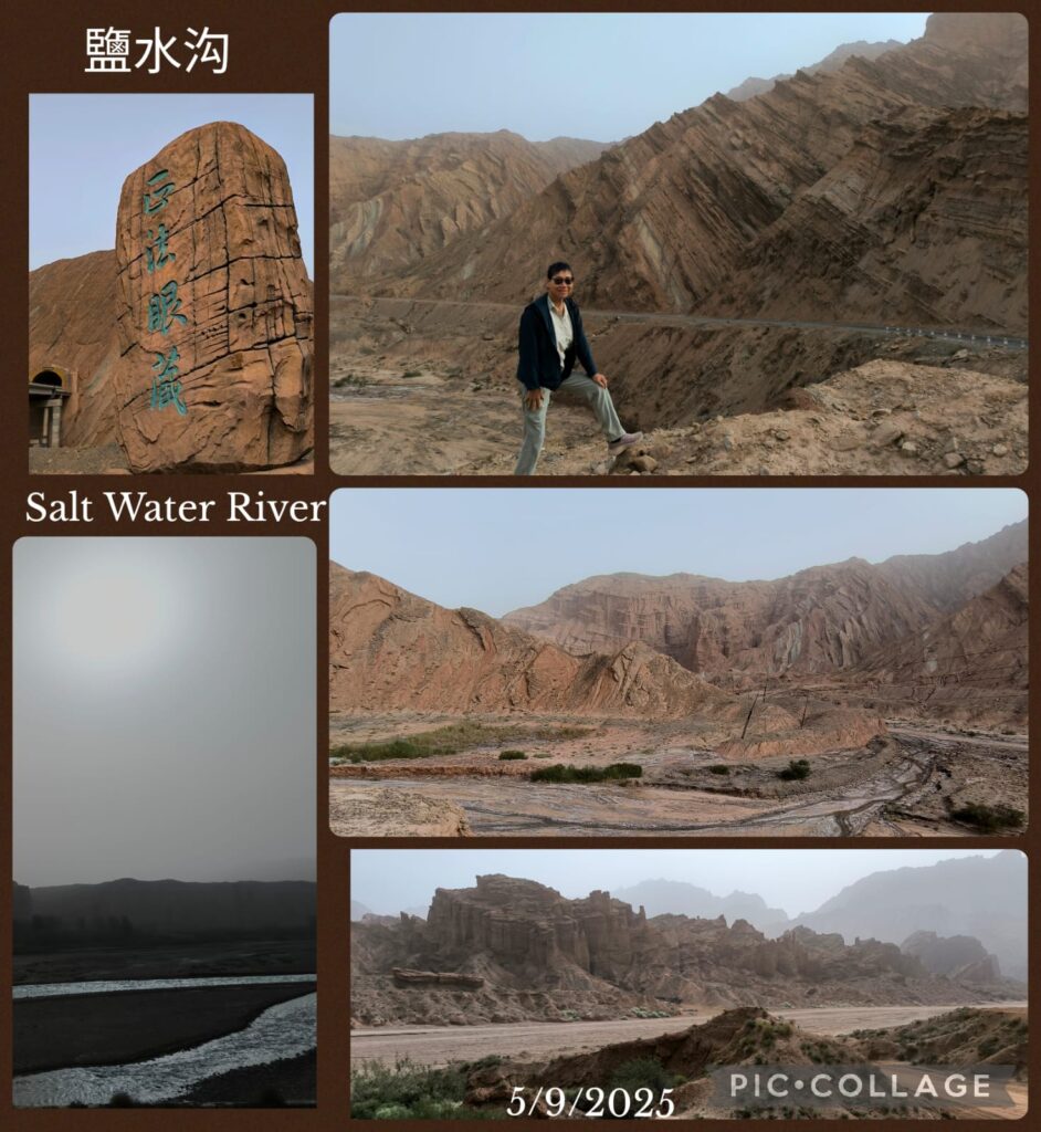 We spent two hours in the Kizilya Scenic Spot located in a salt water river canyon area with unique landscape: distinctive Danxia landform featuring colourful, layered rock formations and dramatic canyon terrain. We had three stops. At the first stop, Li, Roger and I even explored a newly developed path and got lost. At the end of a small canyon, we arrived at an open air temple! At the second stop, we climbed up a sandy slope to reach a flat top named Harry Potter Fortress! We had a nice lunch in a new restaurant nearby where we had delicious steamed fish and fish soup. A nice surprise!