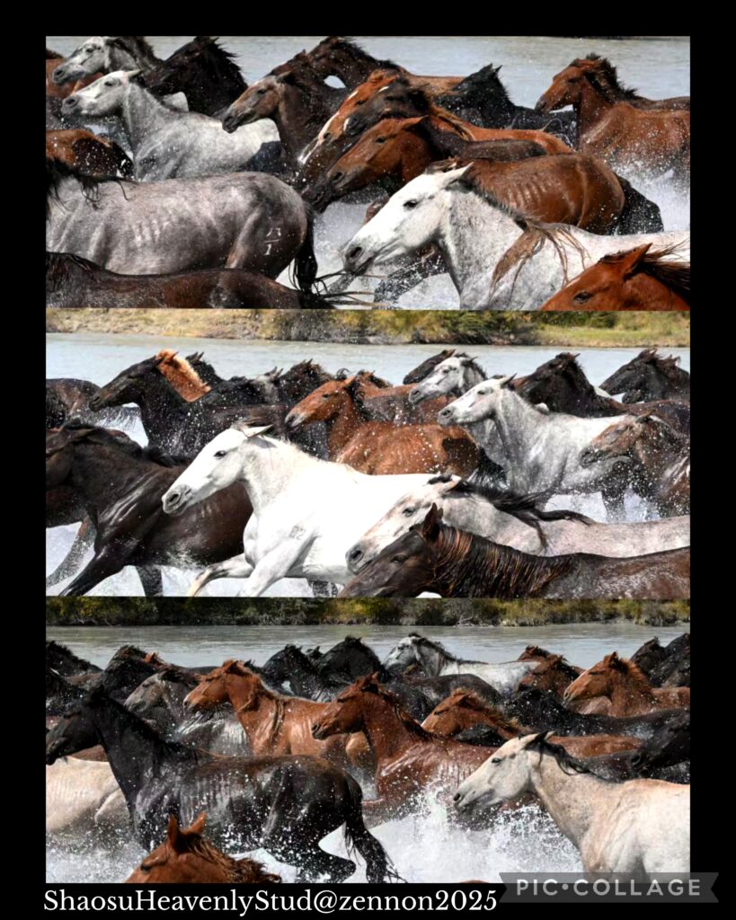 We set off at 8:30 am for the Zhaosu county, which is under the administration of Ili Kazakh Autonomous Prefecture and shares a border with Kazakhstan. Zhaosu region is the home of the famous Heavenly Horse 天馬 that Zhang Qian brought back to Emperor Wu after his mission to Xiyu. I love watching the landscape and topography along the highway. Today, I could see golden wheat along the road side ready for harvest. After lunch, we drove on and arrived at the wetland scenic area around 3pm. There were few birds in the wetland. The show began at 4pm. I took a vantage point watching some 50 majestic Heavenly Horses gathering at the starting point and running in the river. Beautiful animals!