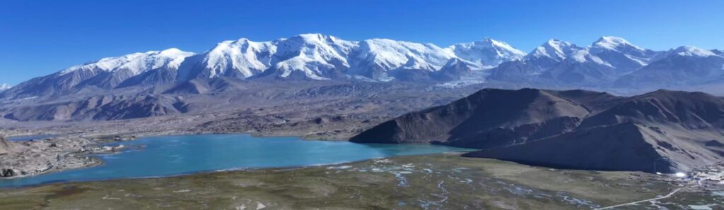 We set off at 9am and had two nice photo stops to take photos of Mt Muztaga and the grassland. The panorama photo of the snow-capped mountains and the lake was taken with drone by our driver Wang.