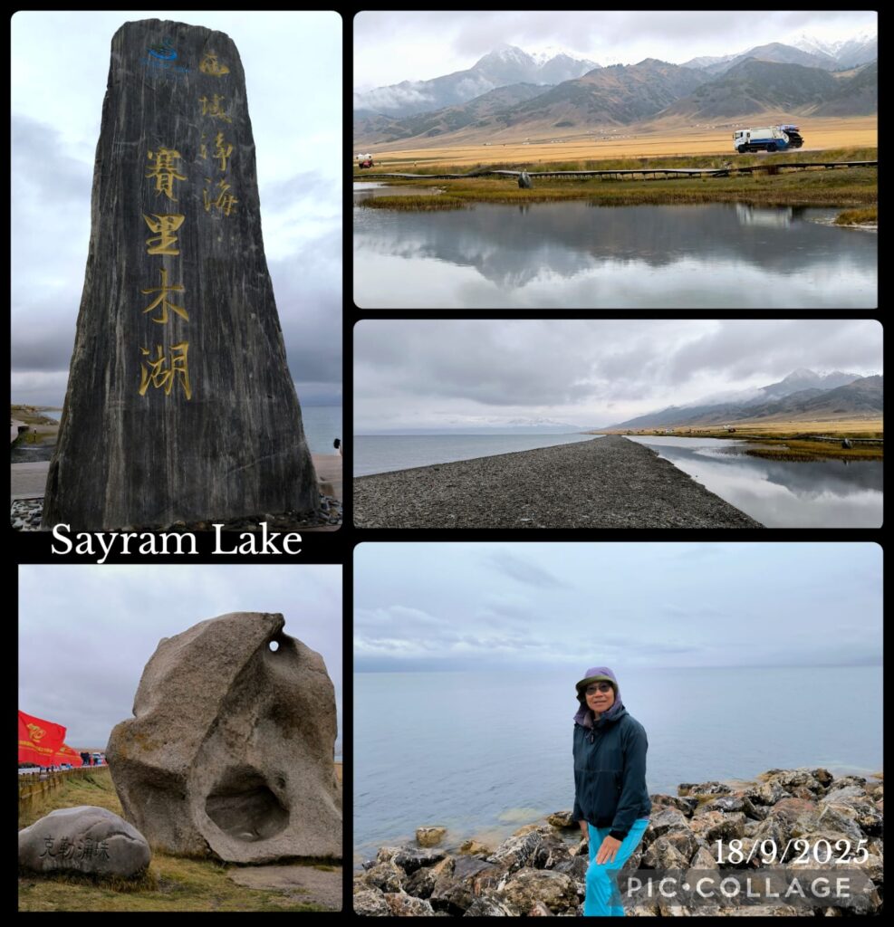 The programme today was a drive around the Sayram Lake (historically known as the “Clean Lake”) which is an endorheic freshwater lake in the northern Tianshan Mountains at Bortala Mongol Autonomous Prefecture less than 50 km from the border with Kazakhstan. At an elevation of 2070m above sea level, the lake has a surface area of 459 km² and a round-the-lake drive of 100km. We would have four stops including the Commanding Platform Relic Park with Eight Banners and the swan area. We saw plenty of gulls but no swan. Luckily the weather improved slightly: at least it was not raining heavily whenever we stepped off the vehicle.