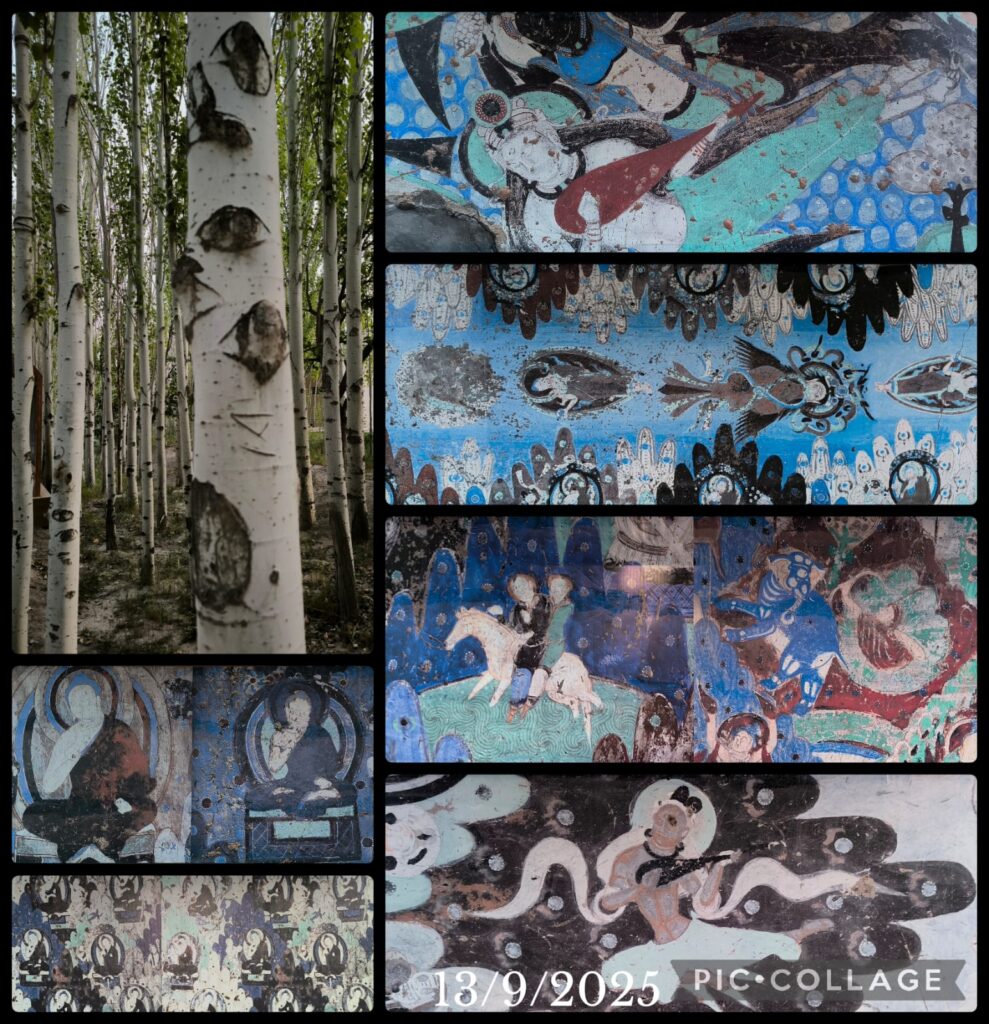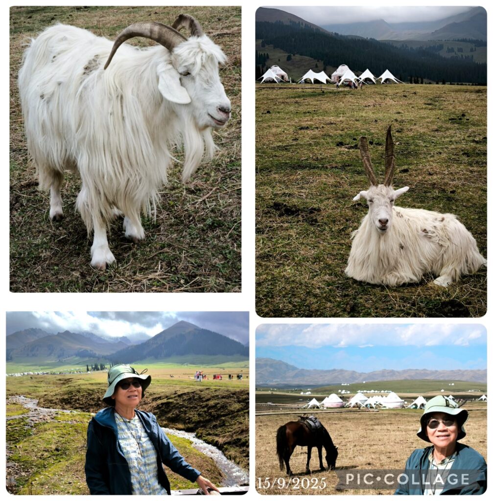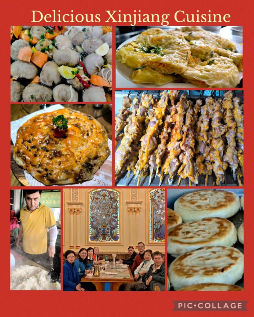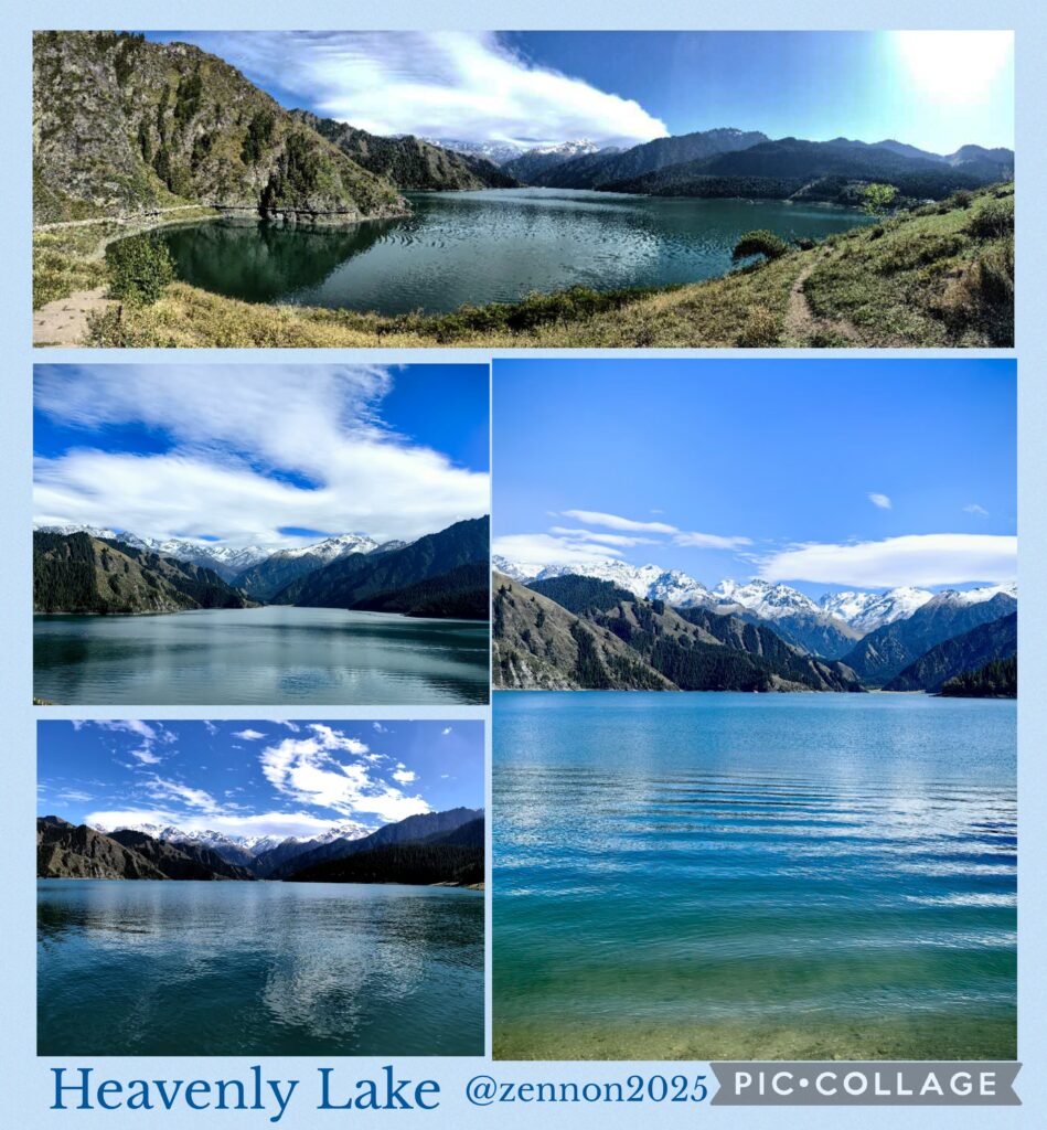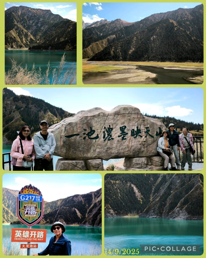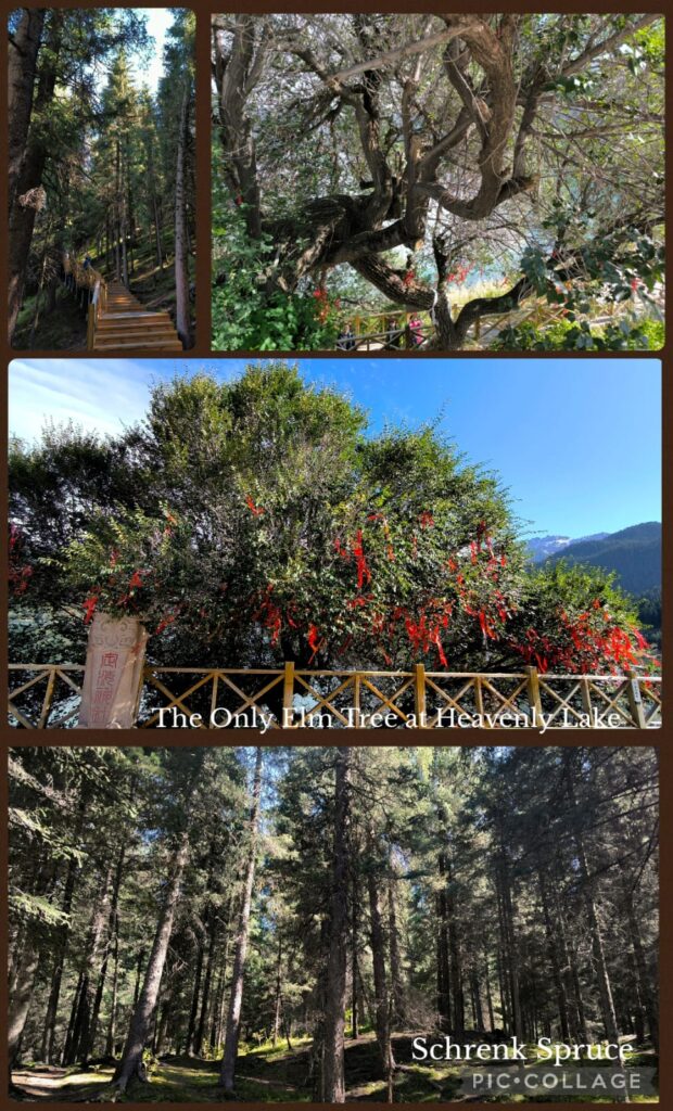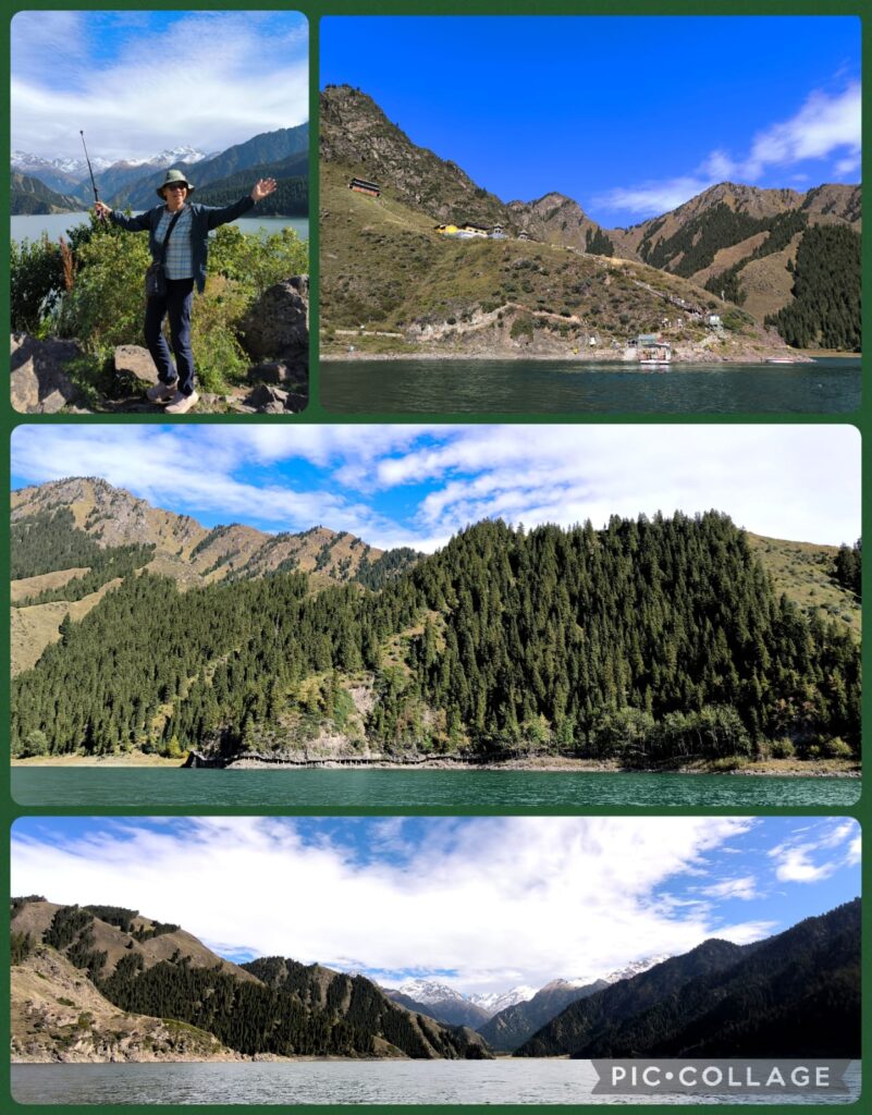 I was glad to meet up with Masy and Jenny whom I met on the Shikoku Pilgrimage in 2012 and 2023 respectively. I also met a monastic whose name I have heard before. Good karma! I visited Tianshan during my first visit to Urumqi when we rode a horse to reach Tianchi 天池 (Heavenly Lake), an alpine lake with an area of 4.9 km² located at 1,907m above sea level. Today, Tianchi is a top attraction with a fleet of buses taking visitors from the visitor centre for a 30-min ride up the mountain. Then we walked for another 10 -15 minutes to reach the lakeside. Li arranged us to take a boat ride followed by an hour’s free time to explore on our own. I walked along the lake and saw the thousand-year old elm tree (the only elm tree in the lake area). I was amazed by the beautiful coniferous forests comprising primarily the Schrenk’s spruce, and the geology of the area. We departed at 6 pm and had a simple dinner next to the hotel.