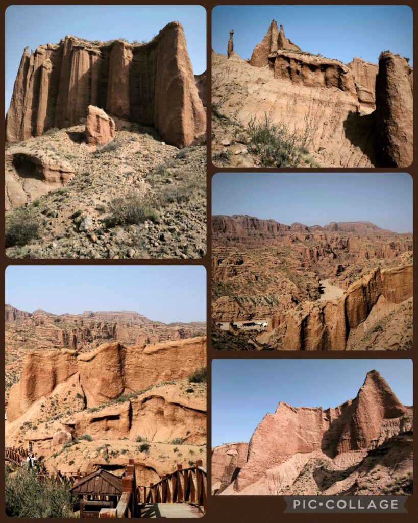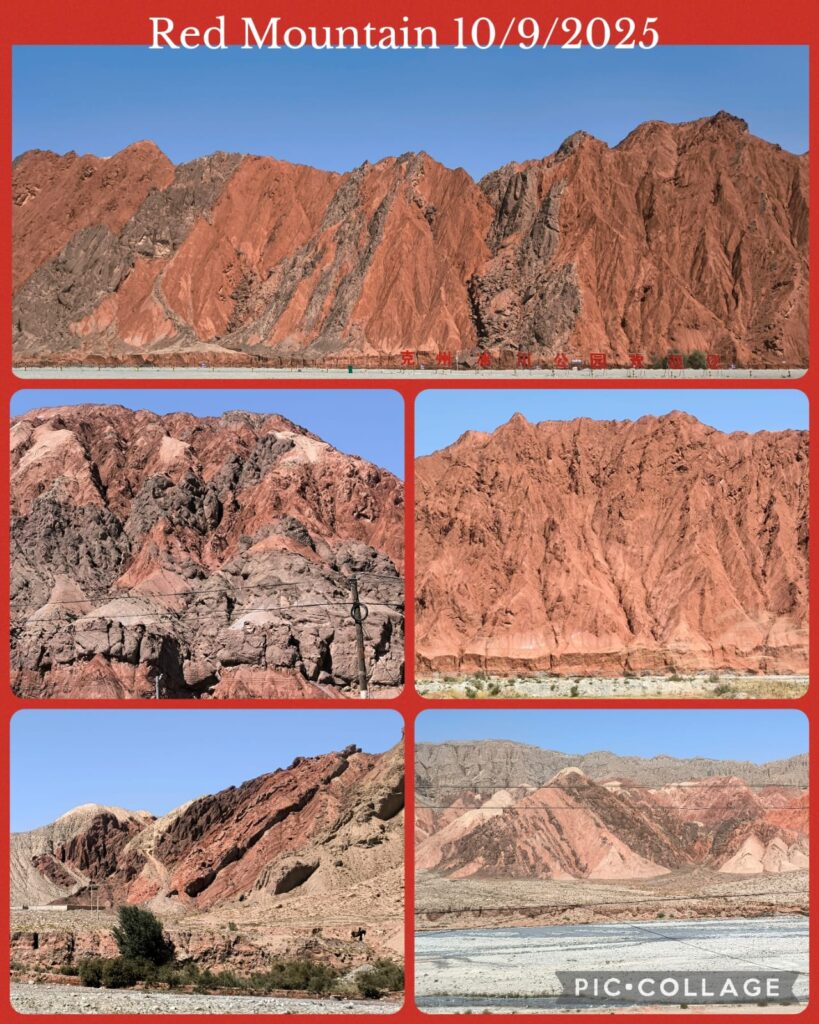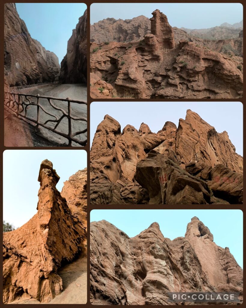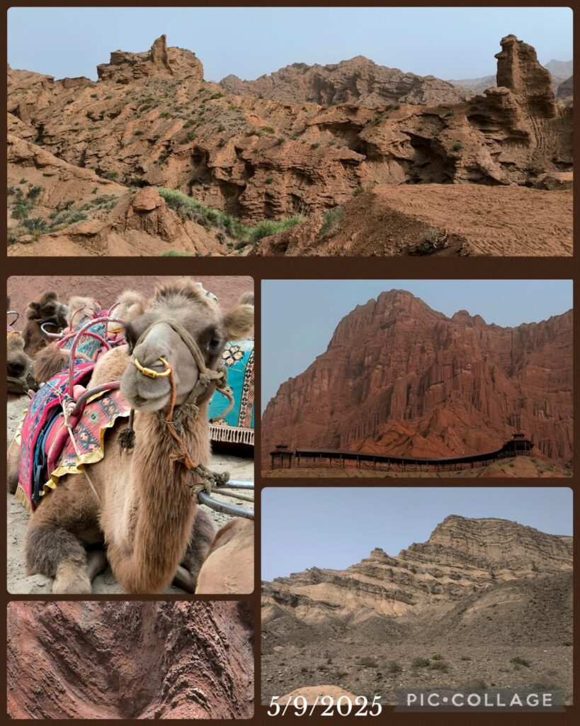 We spent two hours in the Kizilya Scenic Spot located in a salt water river canyon area with unique landscape: distinctive Danxia landform featuring colourful, layered rock formations and dramatic canyon terrain. We had three stops. At the first stop, Li, Roger and I even explored a newly developed path and got lost. At the end of a small canyon, we arrived at an open air temple! At the second stop, we climbed up a sandy slope to reach a flat top named Harry Potter Fortress! We had a nice lunch in a new restaurant nearby where we had delicious steamed fish and fish soup. A nice surprise!