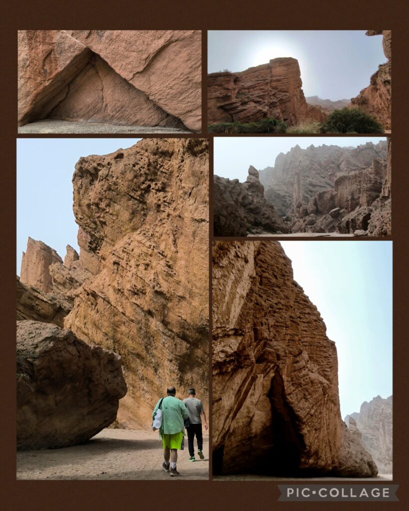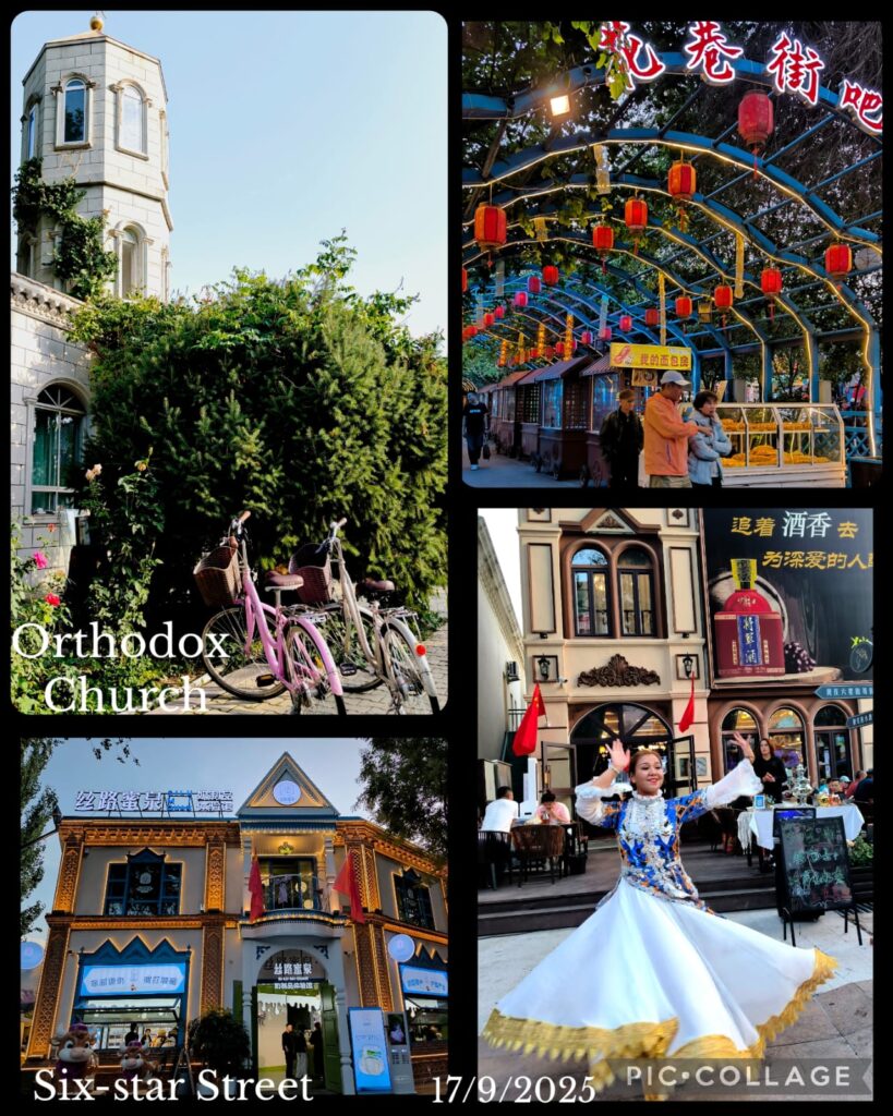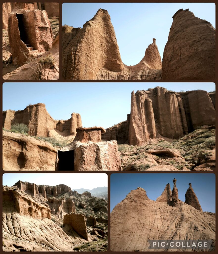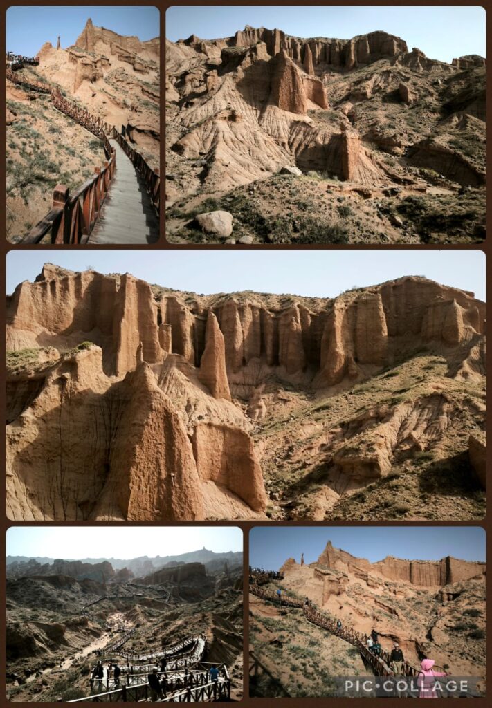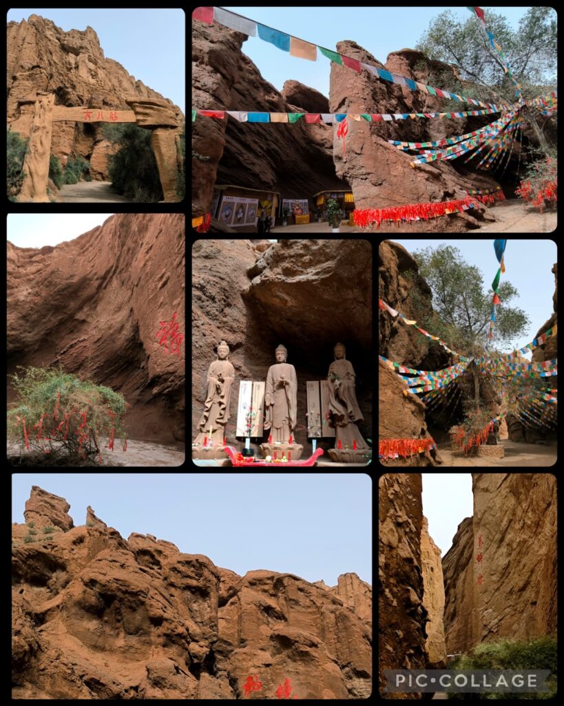 We spent two hours in the Kizilya Scenic Spot located in a salt water river canyon area with unique landscape: distinctive Danxia landform featuring colourful, layered rock formations and dramatic canyon terrain. We had three stops. At the first stop, Li, Roger and I even explored a newly developed path and got lost. At the end of a small canyon, we arrived at an open air temple! At the second stop, we climbed up a sandy slope to reach a flat top named Harry Potter Fortress! We had a nice lunch in a new restaurant nearby where we had delicious steamed fish and fish soup. A nice surprise!