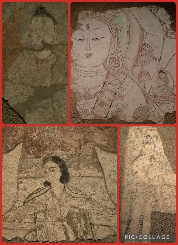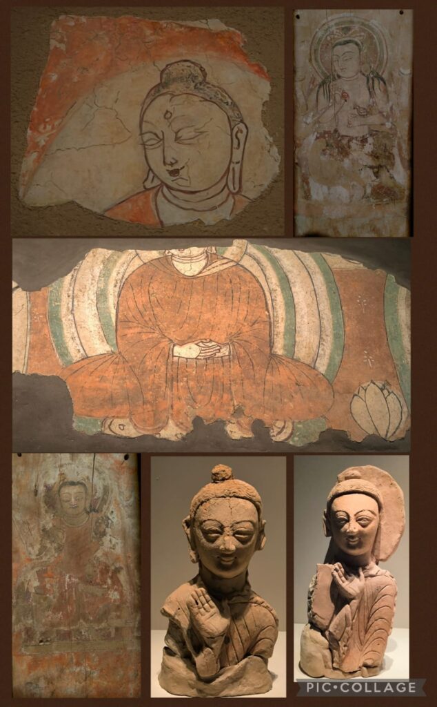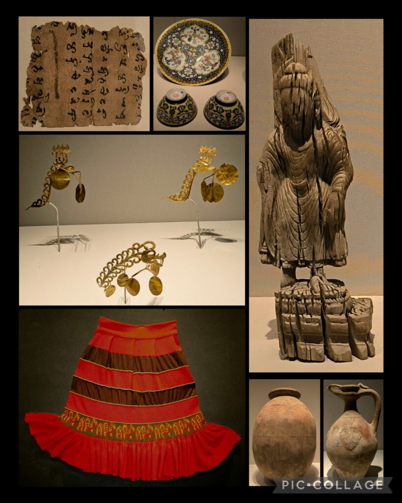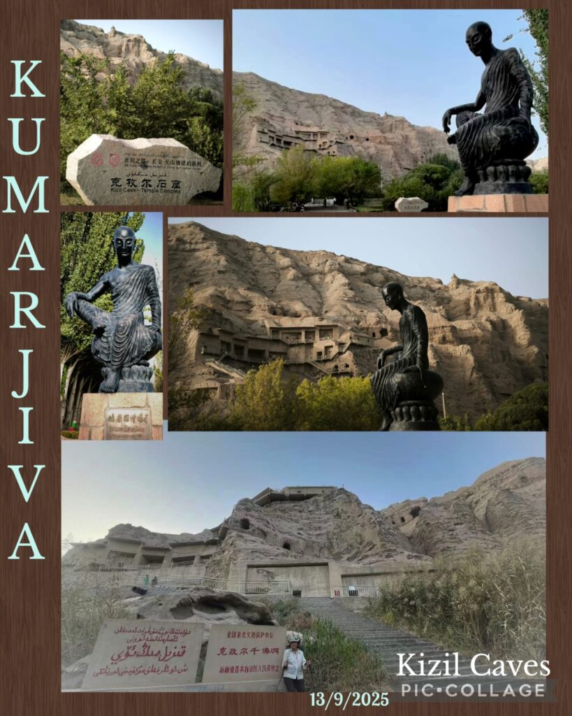 I am interested in history and archaeology. When I caught sight of the Kuqa Wei Jin Ancient Tomb Museum on a notice board at the exit of the naan palace, I asked Li to take us to the museum. The Wei Jin dynasties 魏晉朝 ran from 220 to 420 CE . This archaeological site with some 2,000 tombs was discovered in 2007 and the museum was formally opened in July 2024. Our driver Huang found his way to the Kuqa Museum instead. This museum was formally opened in May this year. We paid for a guide for 100 RMB and had a good tour for an hour visiting two exhibition halls. I learned more about Quici, the motherland of Kumarajiva鳩摩羅什 (344 – 413CE), a Buddhist monk, scholar, missionary and one of the four greatest translators of Chinese Buddhism.