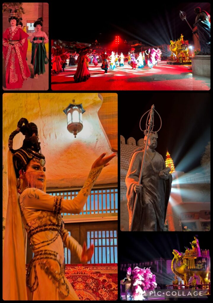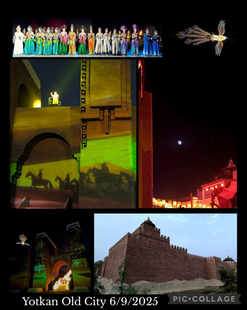 At 7:45 pm, Li took us to the Yotkan 約特干Old City built on the site of ruins about 11 km west of Hotian. The buildings were modeled on descriptions of the palace, architectures of the palace, streets and city walls of the Khotan Kingdom. Li said 500 millions RMB were spent in constructing this attraction. There is a daily show from 9:30 to 11 pm that showcases the history of Khotan with reference to its royal family, Zhang Qian and Ban Chao 班迢 (32-102 CE) both were closely associated with the expansion of the Han Dynasty territory to Xiyu and eventual development of the so-called “Silk Road”. Tourists would follow the performers walking through the entire site. Unfortunately with my hip problem, I can’t walk for hours. Instead, I found a comfortable place, sat down and watched a full blue moon rising. Cool! Sam was tired and joined me. We watched the finale in front of where we sat before joining others to return to the hotel. The show actually finished at 11:15pm and we were back to hotel around midnight! Once again, it is a pity I had no chance to visit some famous Buddhist temple ruins including the Andir Ancient City, Niya, Balawaste, and Rawak.