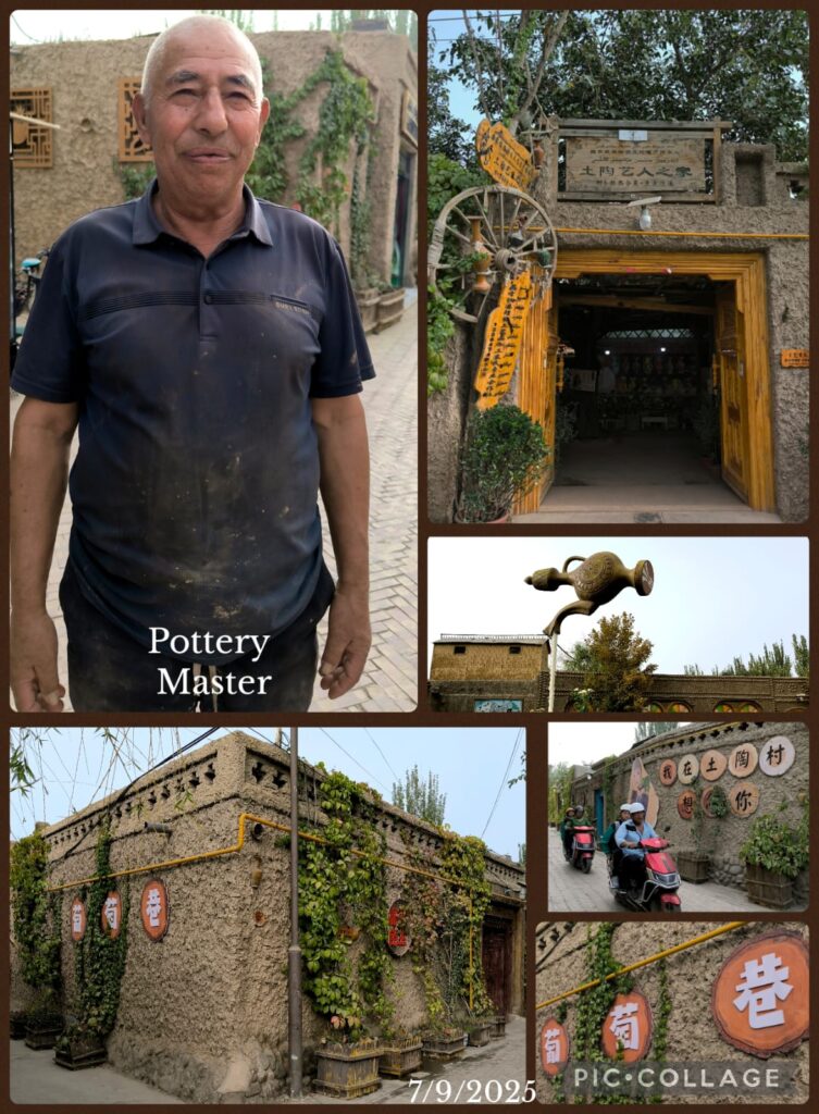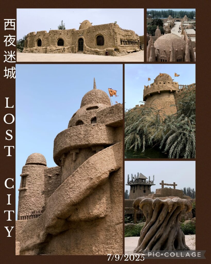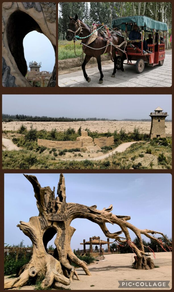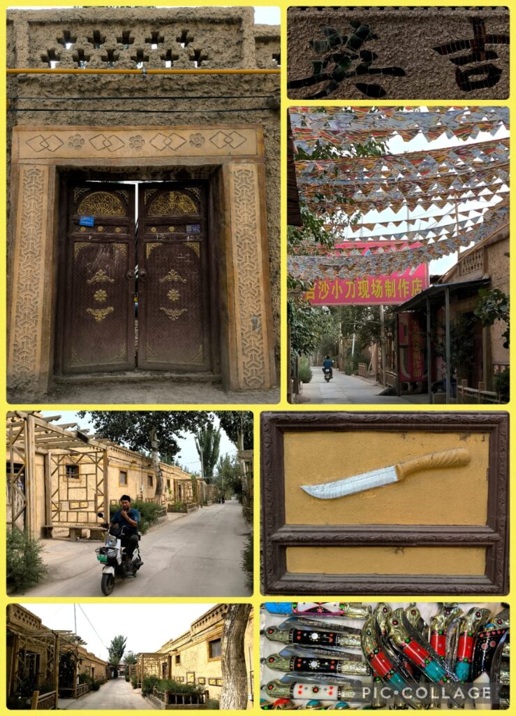 We departed at 9 am and had lunch before heading to the Xiyu Lost City 西域迷城 at Ye Cheng 葉城. It is a new tourist attraction built next to an expansive archaeological site. We took a horse ride and spent an hour and a half looking at rustic mud houses, a palace and city walls. I climbed up the walls and saw a desolate desert with expansive ruins close by. I think the archaeologists are still trying to unearth the secrets below. I like this place much more than the tourist Disney-like Yotkan Old City. It was so hot that I did not attempt to walk along a trail with the names of the legendary Xiyu 36 Countries.