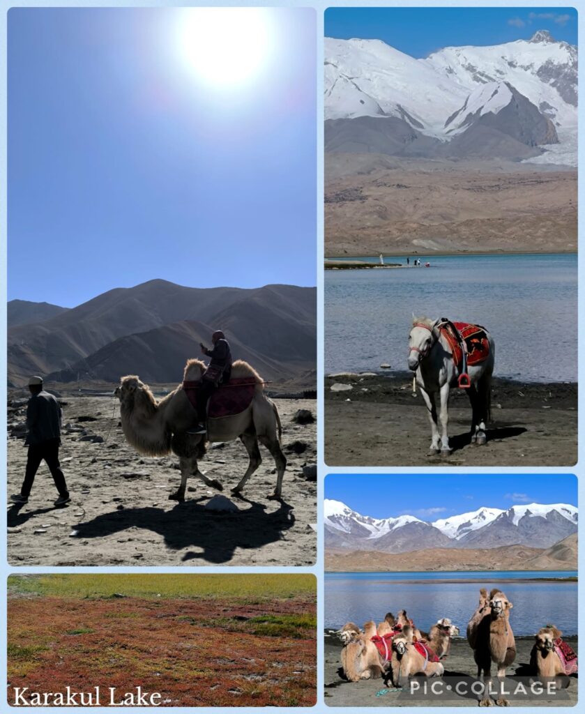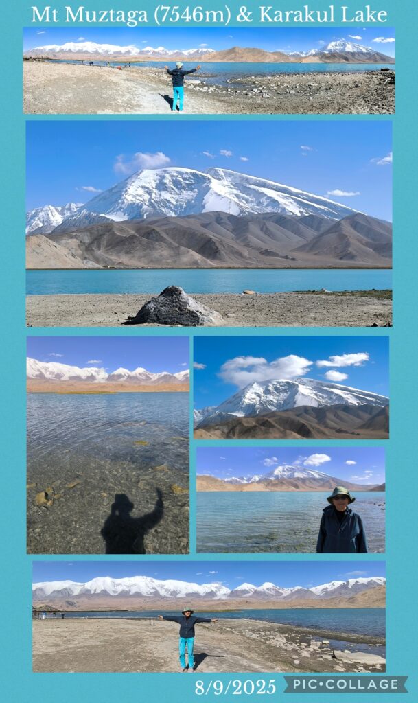 The stop at the Karakul Lake 卞拉庫勒湖 (elevation 3600m) with a surface area of 4.8 km², was much more enjoyable. The weather had improved with blue sky and reflections of the snow-capped Mt Muztaga 慕士塔格峰 (7546m), Kongur Tagh 公格尔峰 (7649m) and Kongur Tiube 公格尔九别峰 (7530m).