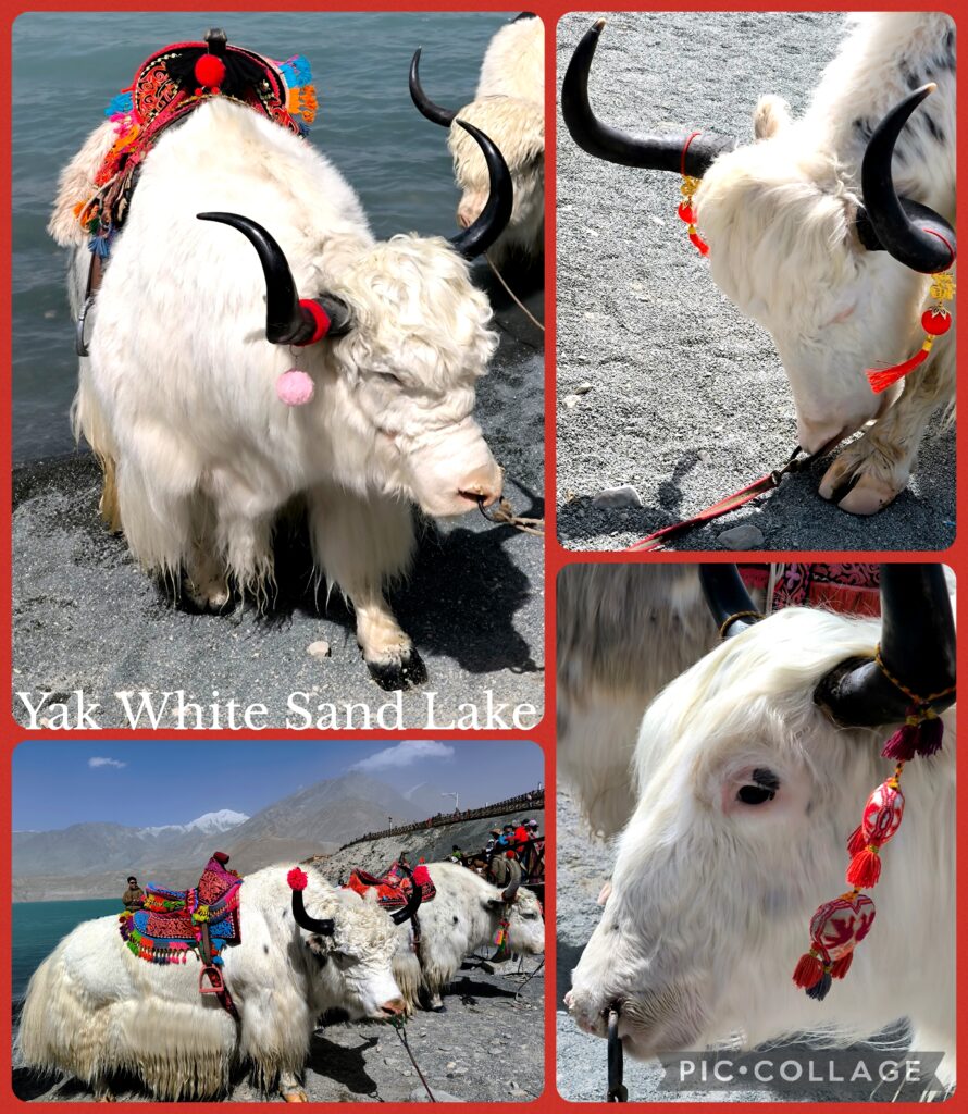 We drove along G314 (the China-Pakistan Highway). Our first stop was the White Sand Lake 白沙湖 (elevation:3100m). Unfortunately, we were stuck for almost an hour before we could pass through the check-point for Tashkurgan. It was almost 3 pm when we had a quick lunch by the lake. The weather was not good with poor visibility: we could hardly see the snow-cladded mountain range surrounding the lake and the White Sand Mountain. Anyway, we had an hour free time. I strolled along the lake and watched the Mainland Chinese taking photos with white yaks. ,