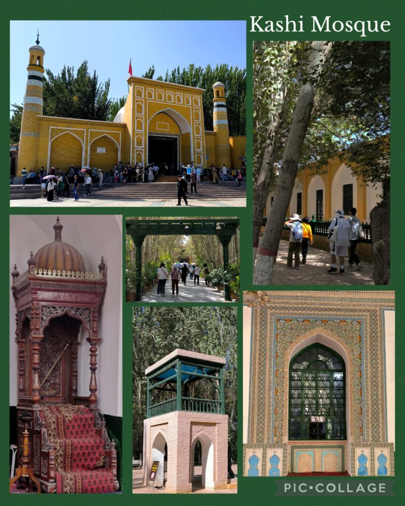 Then we walked across the road to the Kashi old town scenic area 喀什古城景区modeled on the old town. It is all about shopping! After lunch, we walked across the road to reach the mosque 艾提尕尔清真寺and explore the area around it. I walked slowly on my own and had a most refreshing pomegranate juice (15 RMB). I reached the Rainbow Alley彩虹巷 before walking back to the mosque to meet up with the group at 4 pm. We had a quick tour of the mosque which is smaller than I have thought. I wonder whether it is still in use: it looks more like a museum!