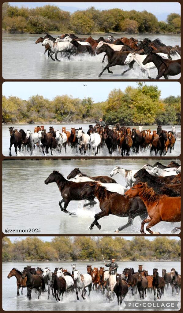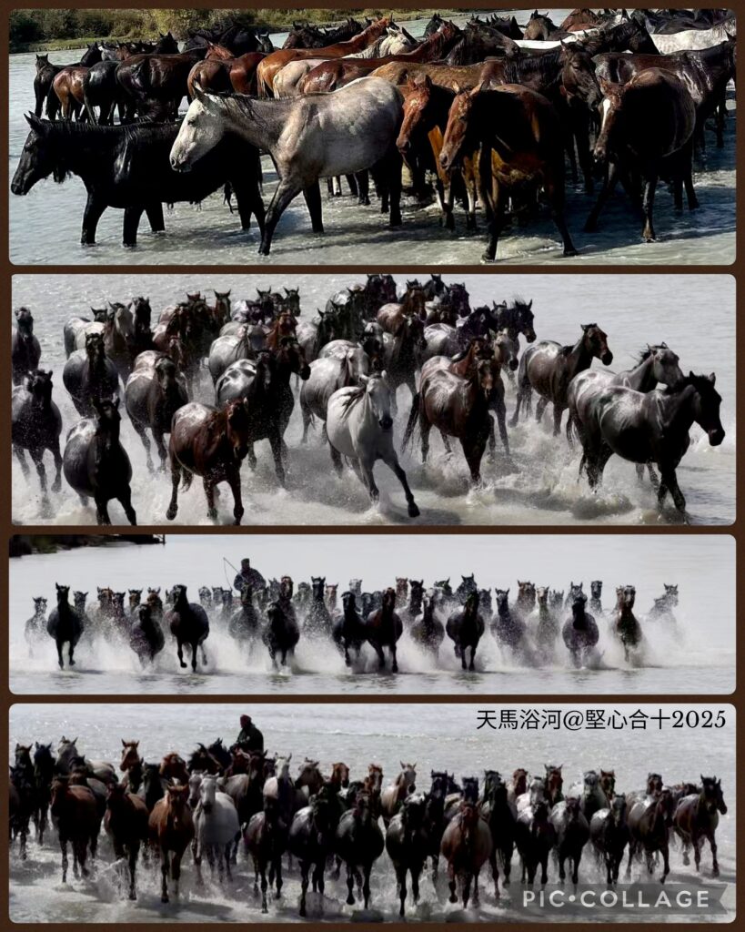 We set off at 8:30 am for the Zhaosu county, which is under the administration of Ili Kazakh Autonomous Prefecture and shares a border with Kazakhstan. Zhaosu region is the home of the famous Heavenly Horse 天馬 that Zhang Qian brought back to Emperor Wu after his mission to Xiyu. I love watching the landscape and topography along the highway. Today, I could see golden wheat along the road side ready for harvest. After lunch, we drove on and arrived at the wetland scenic area around 3pm. There were few birds in the wetland. The show began at 4pm. I took a vantage point watching some 50 majestic Heavenly Horses gathering at the starting point and running in the river. Beautiful animals!